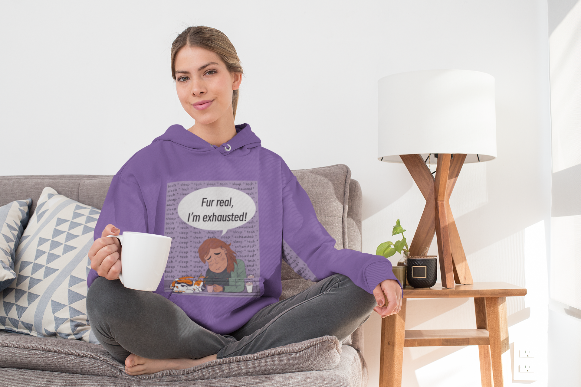 Hand-colored by me with muted tones and a soft grey speech bubble — a premium refresh of the classic black-and-white version. Available in Heather Navy, Team Purple, Heather Forest, and Athletic Heather to make the burnt orange cat and lavender-grey exhaustion vibes pop.