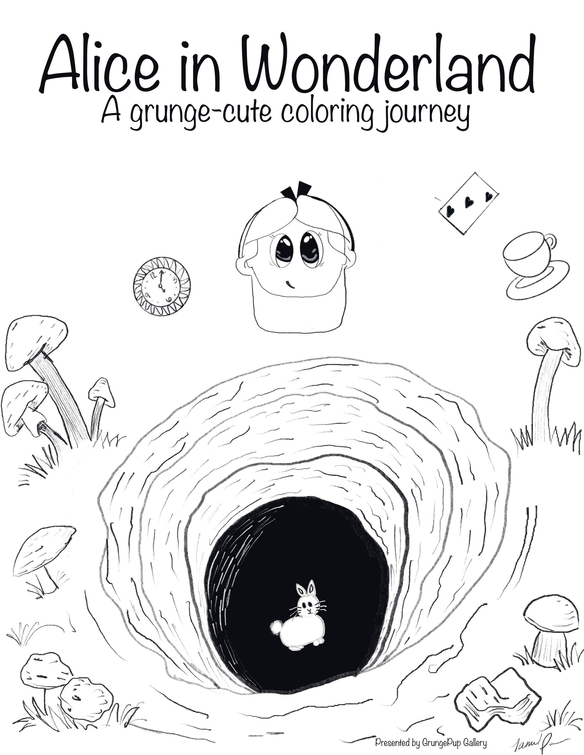 Step into a grunge-cute Wonderland adventure with this 5-page digital coloring set from GrungePup Gallery. Featuring Alice inspired characters and scenes. Printable at 8.5x11 inches, perfect for personal use - no resale. Ideal for a creative escape or a great gift! Download instantly and color away. Questions? Message me!