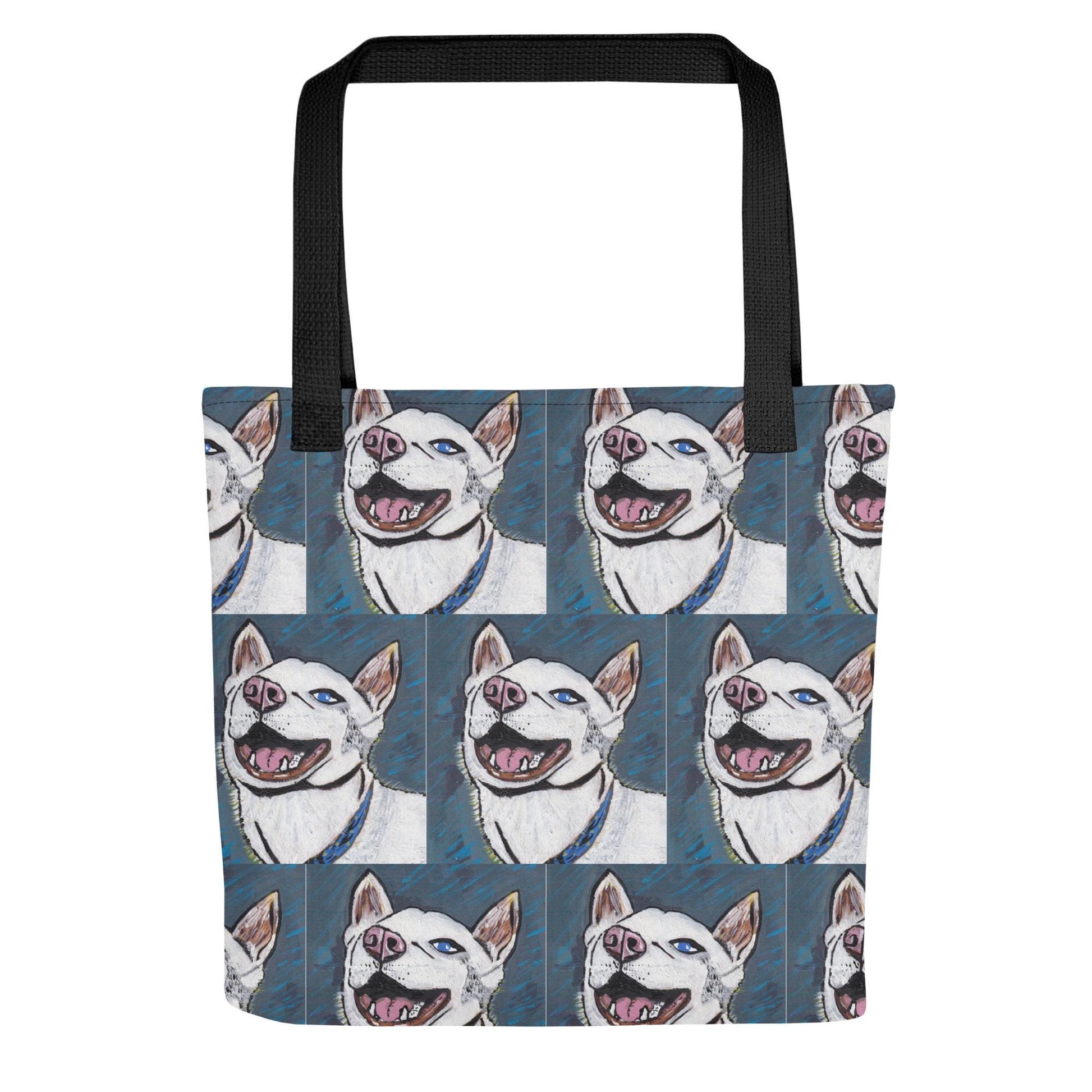 A tribute to Nico, my beloved Husky, in the Patterned Nico Face Tote - GrungePup. This full-color design repeats his white coat with black and gray markings, sparkling blue eyes, and open-mouthed laugh with pink tongue, set against a textured blue-gray background. Bold grunge brushstrokes bring his gentle joy to life, a nod to my vet tech days turned grunge art journey. ON SALE! 15% off with code GRUNGE15.